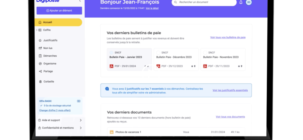 Côté utilisateur, Digiposte permet de recevoir ses bulletins de paie, mais c’est aussi un coffre-fort numérique personnel dans lequel le salarié peut mettre ses documents importants à conserver en sécurité et sur la durée (contrats, actes notariés, diplômes, factures, …). Le coffre-fort numérique appartient au salarié, qui le conserve gratuitement même s’il quitte son entreprise, et l’employeur n’y a pas accès.